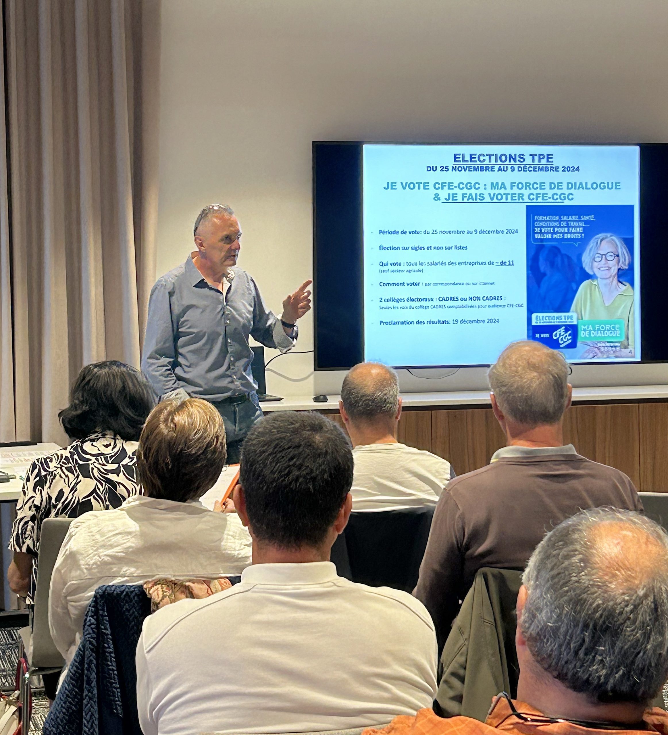Une quarantaine de personnes étaient présentes, la réunion ayant été élargie aux militants du 06. Les thèmes principaux abordés : les élections TPE et les élections des Chambres d’agriculture, qui vont très prochainement avoir lieu, et qui sont la priorité du moment de la CFE-CGC. Laurent Laubry, Président de l’UD06, a mis l’accent sur les enjeux de ces scrutins et a demandé à tous de diffuser les informations dans leur entourage afin de sensibiliser un maximum de personnes.